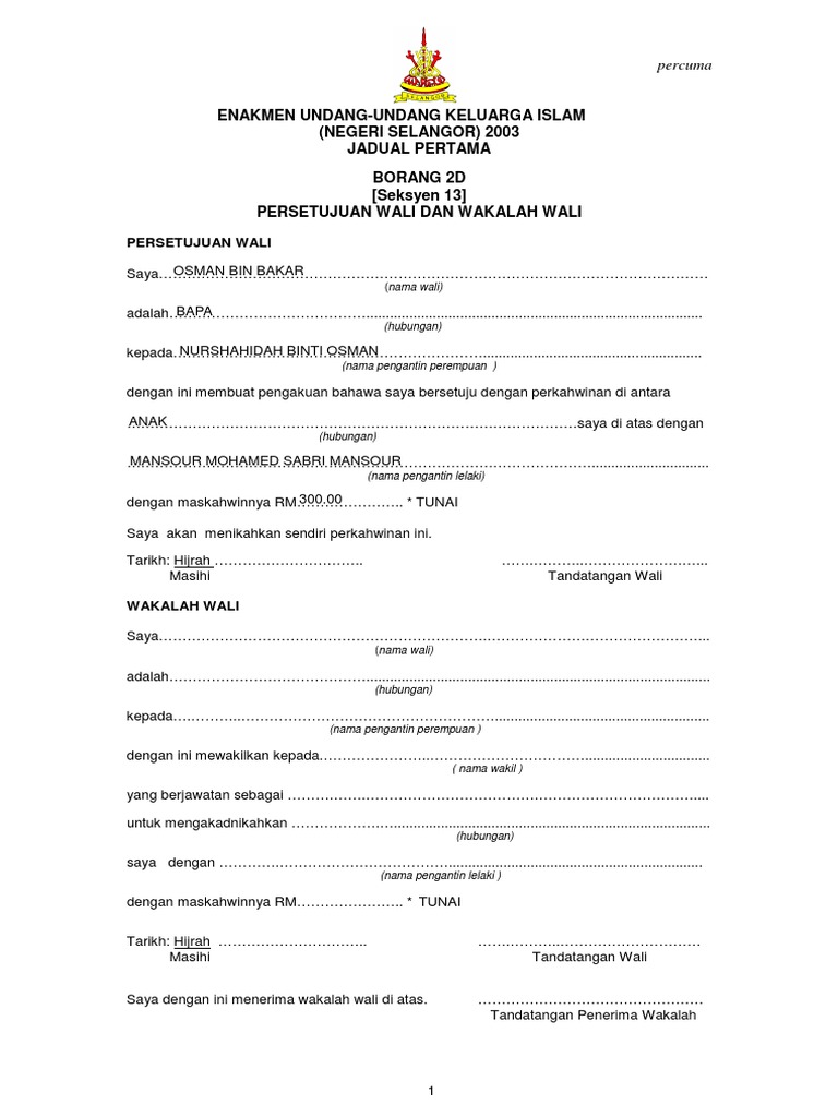 Panduan mengisi borang izin dan wakalah wali enakmen undang undang keluarga islam subseksyen 13 a 1. Negeri sembilan state government shall not be liable for any loss or damage caused by the user information obtained from this site. Senarai semak borang ade 2 salinan carbon copy pengenalan diri pemohon 3 salinan. Wali hakim bertindak sebagai wali kepada pengantin perempuan yang tidak mempunyai wali.