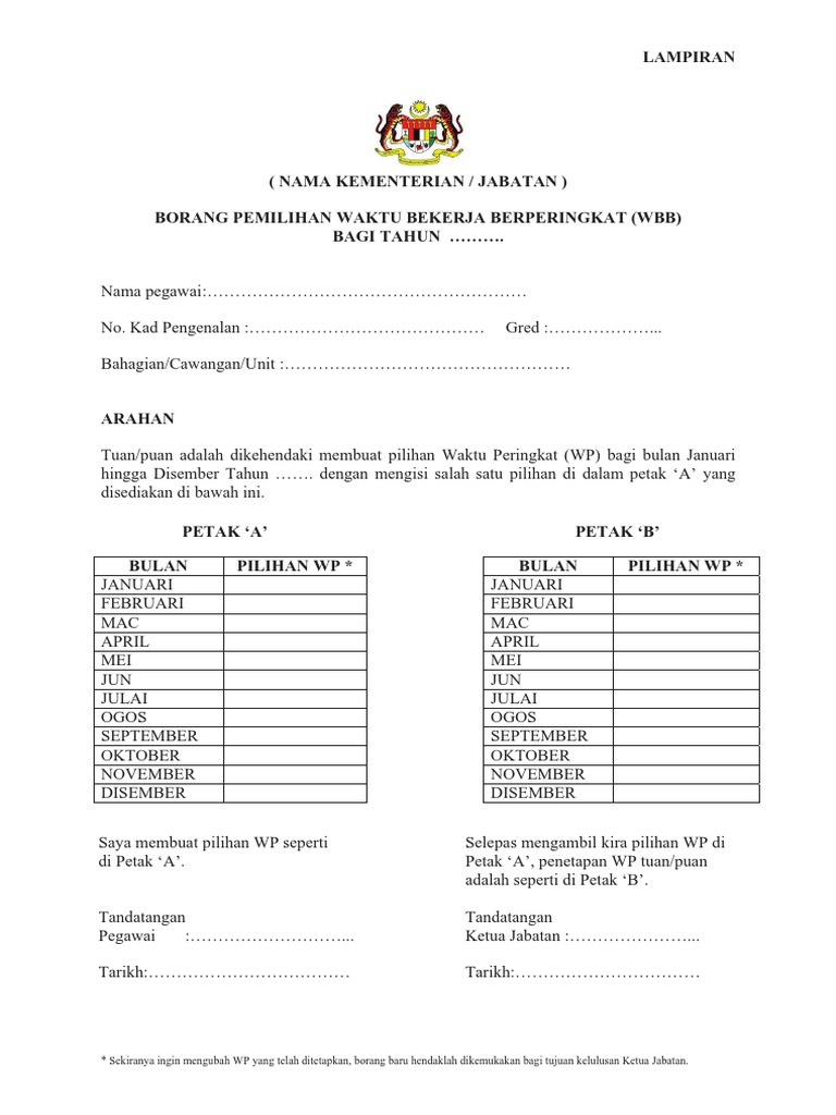 Waktu peringkat wp hari waktu bekerja waktu rehat wp5 isnin jumaat 7 30 pagi 4 00 petang isnin khamis 1 00 petang 1 30 petang jumaat. Tahukah anda bermula hari ini 1 mac 2019 perlaksaan waktu bekerja fleksi wbf penjawat awam akan dikuatkuasakan di semua kementerian dan jabatan persekutuan. Borang pemilihan waktu bekerja berperingkat wbb bagi tahun nama pegawai no. Helaian kerja berkaitan dengan pelepasan ibu bapa hk 15.