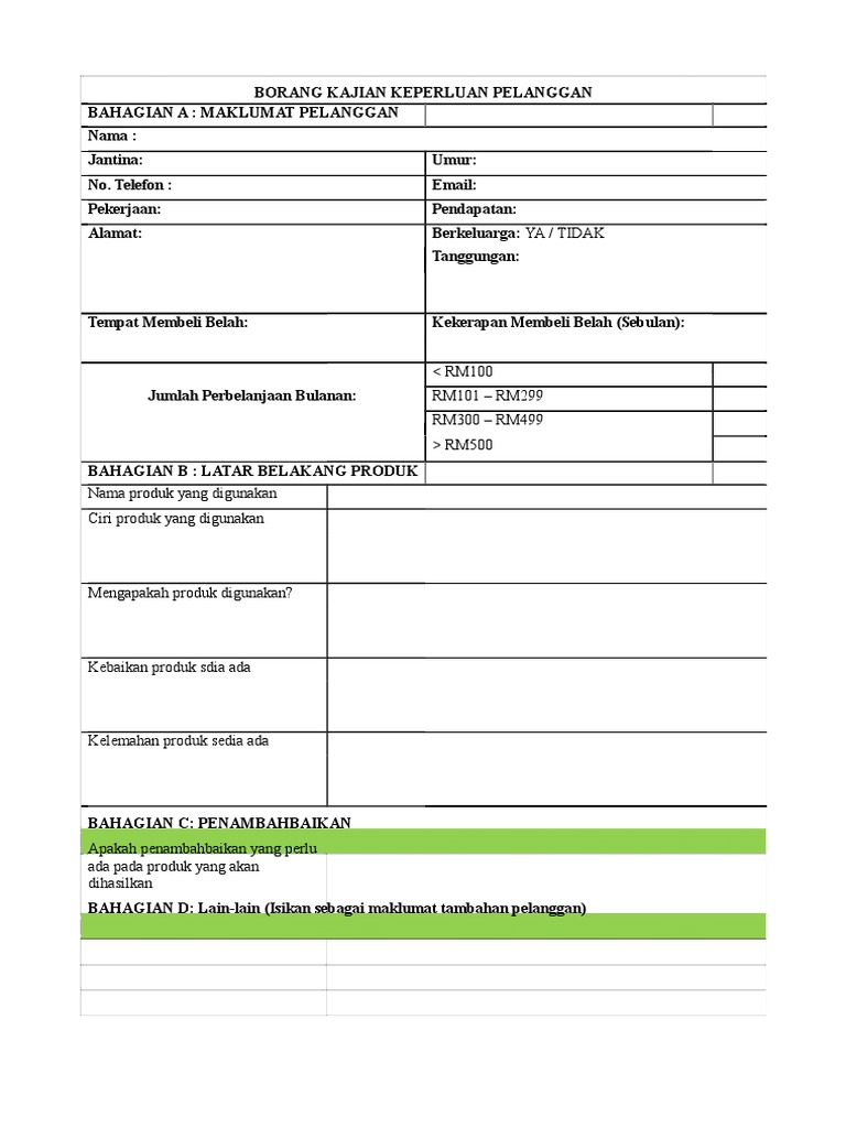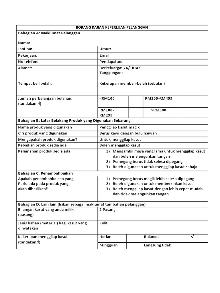 Contoh borang kajian keperluan pelanggan. Ciri ciri hasil inovasi tersebut kelak dapat memudahkan pelanggan menjimatkan masa menyakinkan penggunaannya menarik minat. Kandungan borang kajian keperluan pelanggan boleh diubah suai bergantung kepada maklumat yang dikehendaki pereka bentuk daripada pelanggan. Contoh contoh borang soal selidik. Rbt t1 bab 2 pdpc pengurusan projek pdf document.