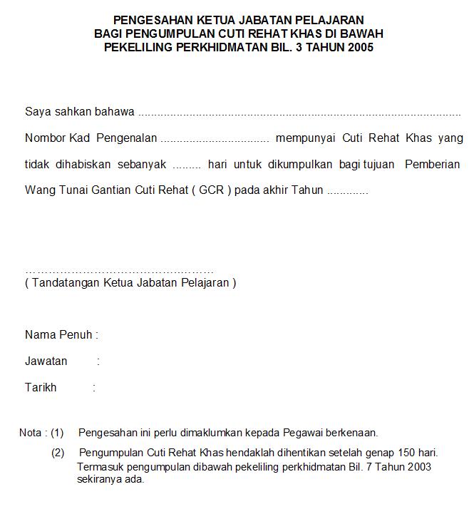Kebenaran ini perlu dimaklumkan kepada pegawai berkenaan. Ganjaran cuti rehat gcr bahagian pasca perkhidmatan jabatan. Tandatangan pemohon catatan. Pengumpulan cuti rehat bagi gcr hendaklah dihentikan setelah genap 120 hari.