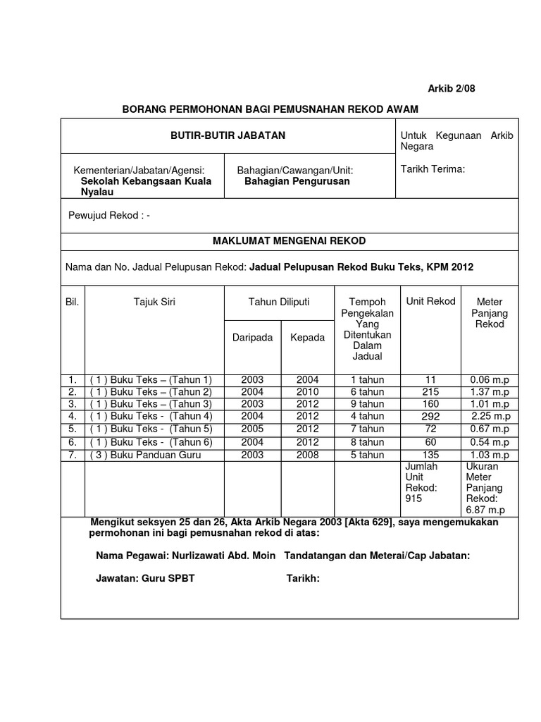 Contoh isi borang arkib 2 08. Senaraikan menggunakan borang arkib 2 08 fail arkib 3 08 rekod elektronik arkib 4 08 rekod kewangan perakaunan terima surat kebenaran pemusnahan daripada arkib negara dalam tempoh 14 hari bekerja kebenaran musnah lakukan pemusnahan dalam tempoh 3 bulan hantar borang penentusahan arkib 12 08 arkib 13 08 ke arkib negara. Pihak kerajaan dan arkib negara malaysia tidak bertanggungjawab terhadap sebarang kehilangan atau kerosakan yang dialami kerana menggunakan maklumat dalam laman ini. Setelah selesai proses pelupusan kontrator mengambil buku pihak sekolah dikehendaki mengisi borang lampiran 2 arkib 12 08 bagi mengesahkan pemusnahan buku teks. 5 7 rekod kewangan dan perakaunan yang menggunakan borang kewangan arkib 4 08 permohonan kebenaran pelupusan hendaklah dikemukakan kepada arkib negara malaysia dan jabatan audit negara.