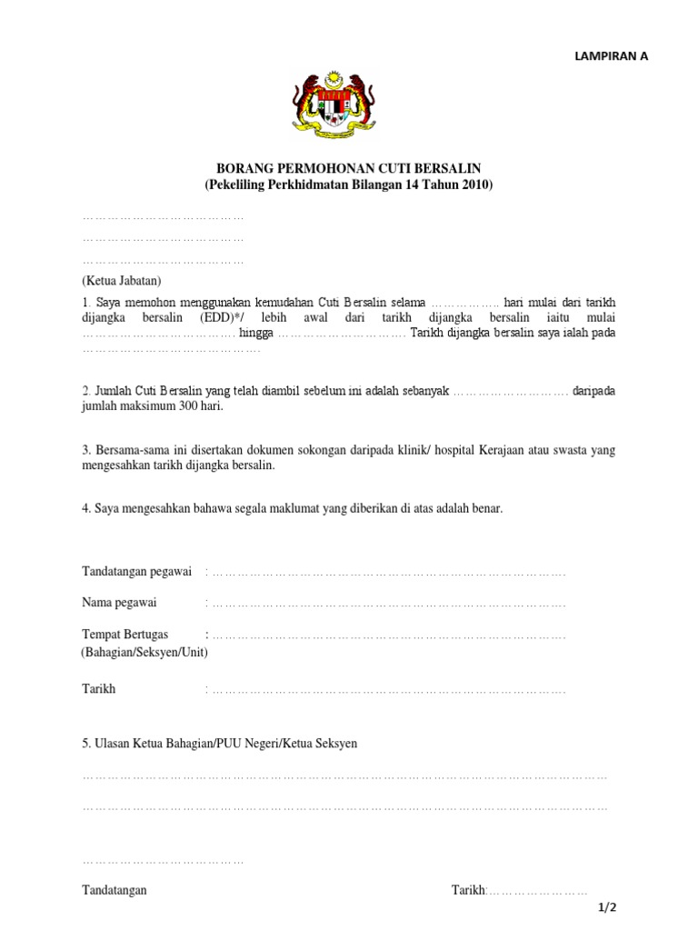 Download borang cuti bersalin. Saya memohon menggunakan kemudahan cuti bersalin selama hari mulai dari tarikh dijangka bersalin edd lebih awal dari tarikh dijangka bersalin iaitu. Menggunakan cuti rehat mulai dari tarikh bersalin. Cuti bersalin pegawai hendaklah mengambil cuti bersalin antara 60 hingga 90 hari dengan menggunakan kemudahan berikut. Sila masukkan nama jawatan dan alamat ketua jabatan 1.