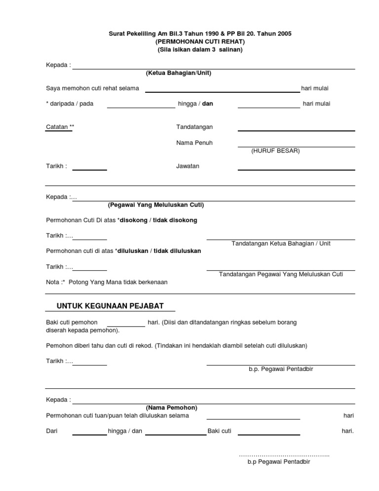 Format permohonan cuti rehat permohonan cuti tanpa rekod permohonan cuti gantian permohonan kenderaan. Pegawai pentadbiran hendaklah diisi dalam 2 salinan borang perlu diisi sebelum bercuti. 12 23 2005 10 46 13 am. Kemaskini pada 2015 12 28 15 19 17 daripada institut veterinar malaysia.