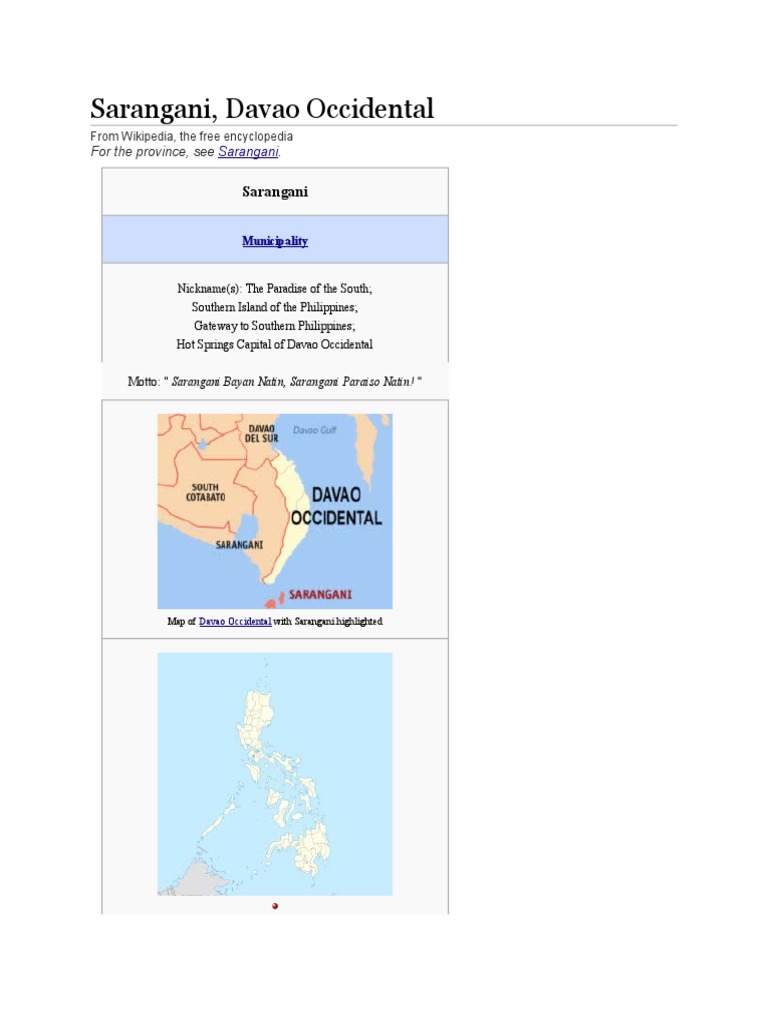 Sarangani is a 4th class municipality in the province of davao occidental philippines. It is home to a big group of blaans and sangils. According to the 2015 census it has a population of 24 039 people. Sarangani is a coastal municipality in the province of davao occidental.