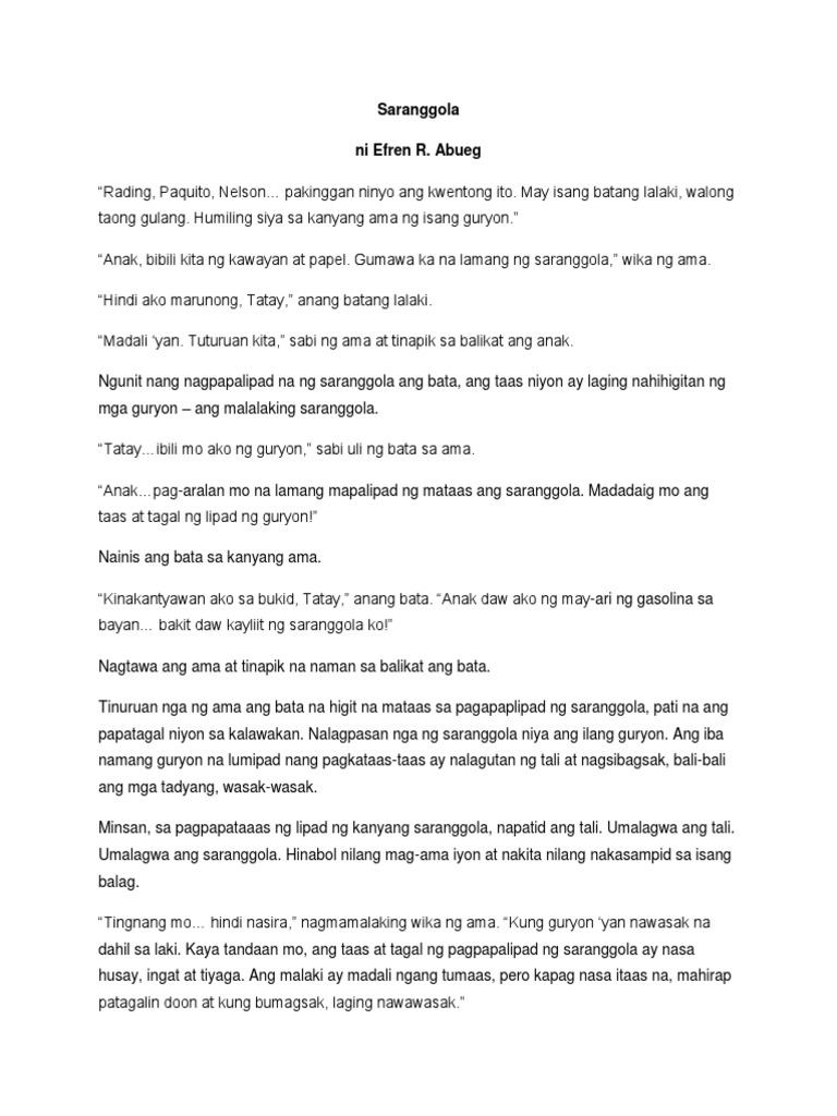 Saranggola ni adrian lance lagumbay paksa ng tula. Bigkisin ang mga salita t pakawalan sa hangin gaya ng saranggola www sba ph una akong sumali sa mga patimpalak sa pagsulat noong nasa elementary school pa lang ako. Tinuruan nga ng ama ang bata ng higit na mataas na pagpapalipad ng saranggola pati na ang pagpapatagal niyon sa kalawakan. Nang sa hangi y mapalapit.
