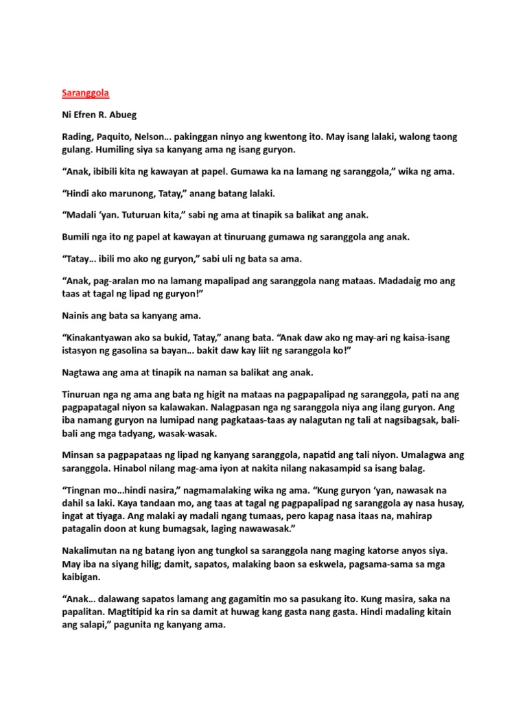 Pag ibig aking biglang namataan sa malayo isang saranggola t ako y nakuntento sa mga kulay at ganda na dala nito ito ba talaga ang hinahanap ko. Human translations with examples. Saranggola ni adrian lance lagumbay paksa ng tula. Habang minamasdan ang saranggola naisip kong maihahintulad ako.