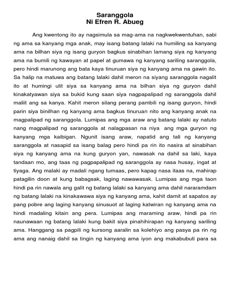 Saranggola ni efren abueg. Abueg ay isang libong kuwento ng kung paano ito naimpluwensiyahan ng isang kilalang manunulat mahusay na manunulat establisado na t kinikilala na ng mga kasamang manunulat sinusuri na ang mga akda ng mga kritiko at pinag aaralan na ang mga akda niya sa canon ng komunidad na pang akademiko. Gumawa ka na lamang ng saranggola wika ng ama. Humiling siya sa kanyang ama ng isang guryon. Anak ibibili kita ng kawayan at papel.