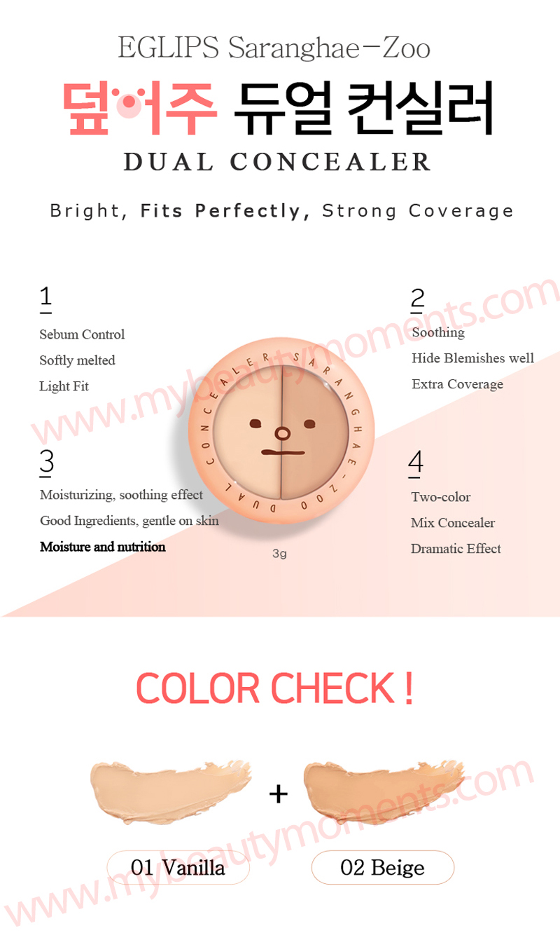 Eglips saranghae zoo dual concealer. 01 dual concealer vanilla 02 dual concealer sand. 0 out of 5 there are no reviews yet. Silica powder gently stick to your skin.