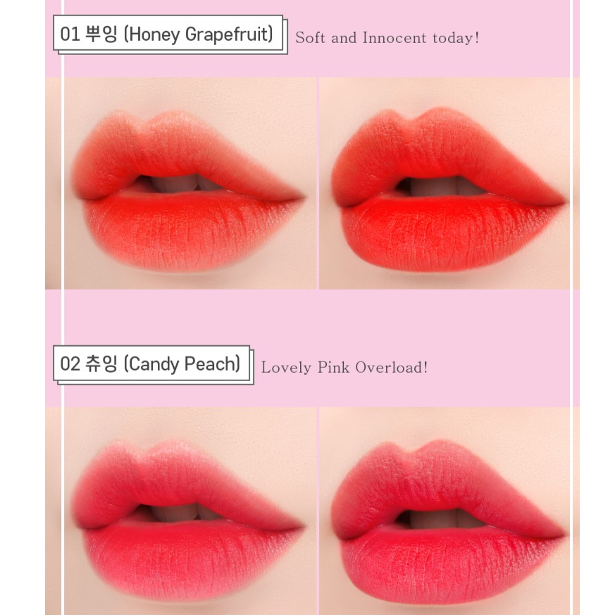 No lip creases or wrinkles. Natural and lively colors. Eglips saranghae zoo tint 4g eglips korean cosmetics. Eglips saranghae zoo cotton candy tint series 1 and 2 soft and smooth velvet texture.